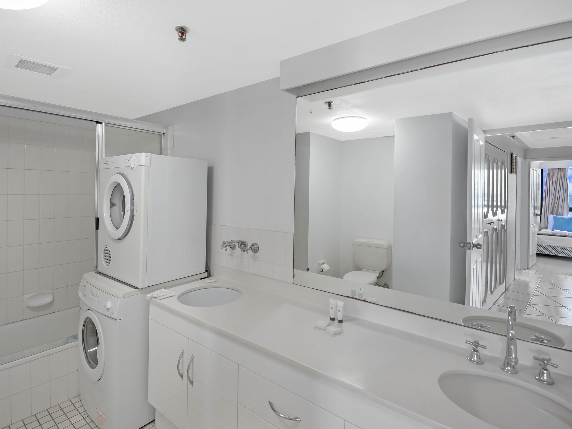 A spacious master bedroom with private ensuite and a second bathroom, both finished in neutral tones