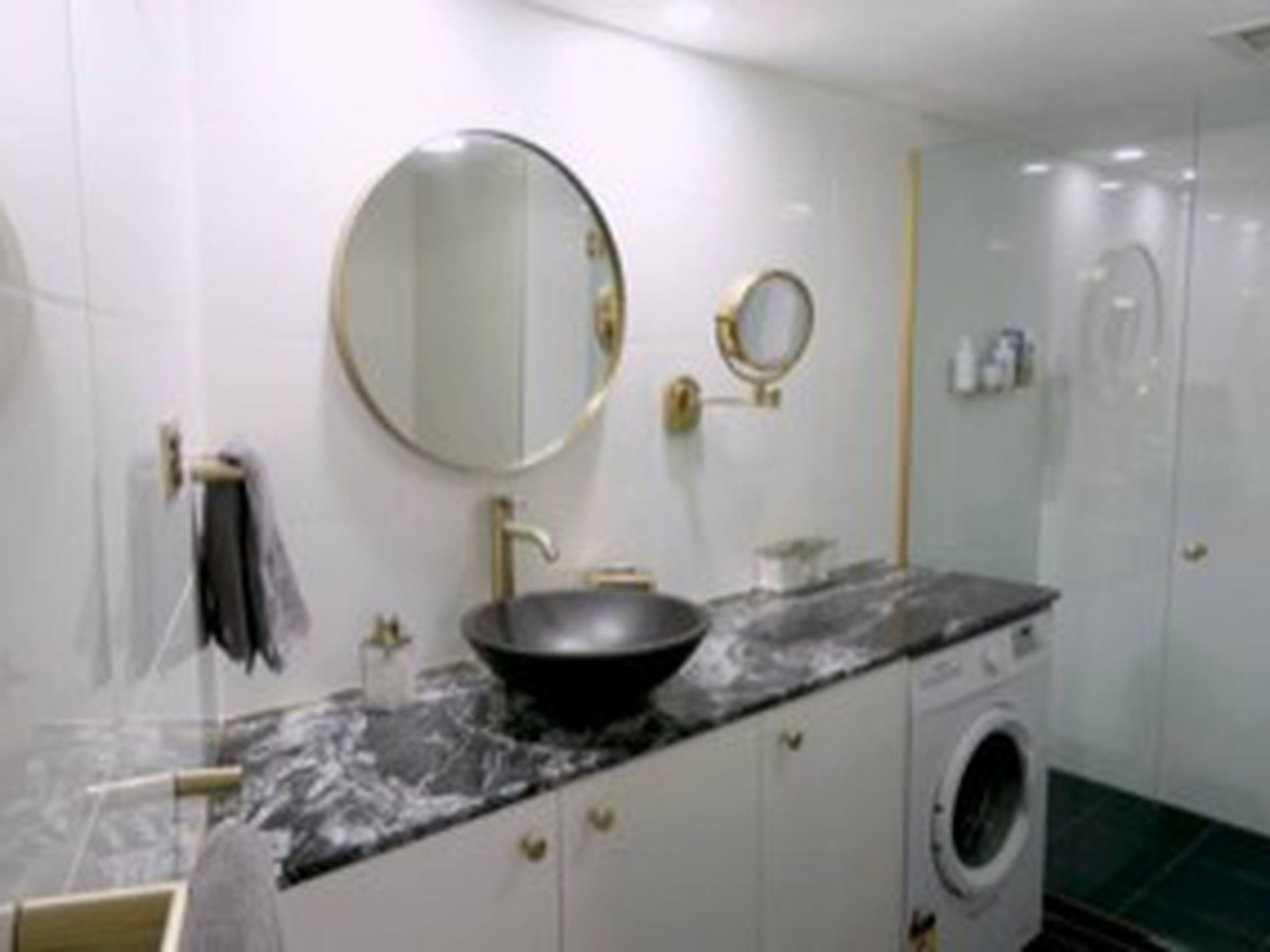 A spacious master bedroom with private ensuite and a second bathroom, both finished in monochromatic tones, simply stunning.